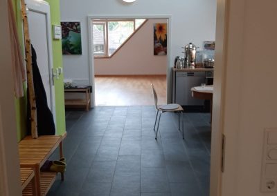 Der Eingang zum freiraum lädt gemütlich zum Plaudern und Verweilen ein. Er ist eher eine kommunikative Wohnküche. Die Wohnküche ist das Verbindungsstück. Man spürt es sofort, wenn die Tür aufgeht: Hier ist ein Ort zum Ankommen, zum Wohlfühlen. Er öffnet das Herz und den Geist für Begegnung. Eine lebensgroße Giraffe über der Eingangstür ist ein Hingucker und zugleich das Symbol für respektvolle, gewaltfreie Kommunikation.