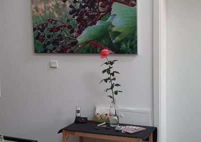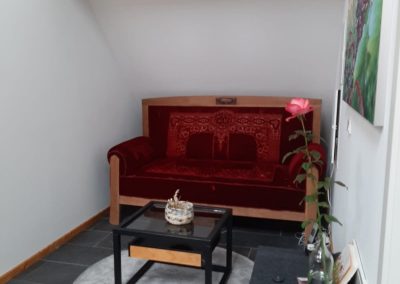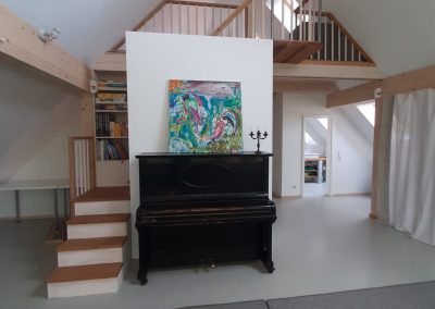 Das Atelier ist mega vielseitig nutzbar. Im Atelier kann sich kreativ ausgetobt werden (da darf auch schon mal Farbe auf den Boden tropfen, dafür ist extra Bodenfließ vorhanden). Dort können aber auch sehr gut Einzelsitzungen stattfinden. Stühle, Couch, Hänge-Schaukelstuhl, Tische – alles vorhanden. Sogar ein Klavier.