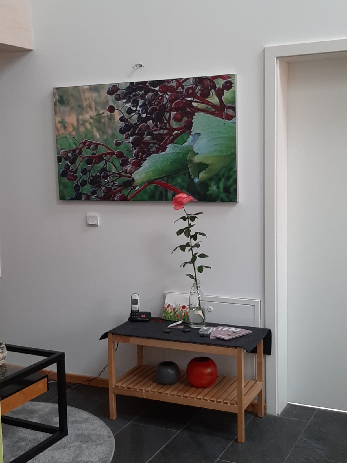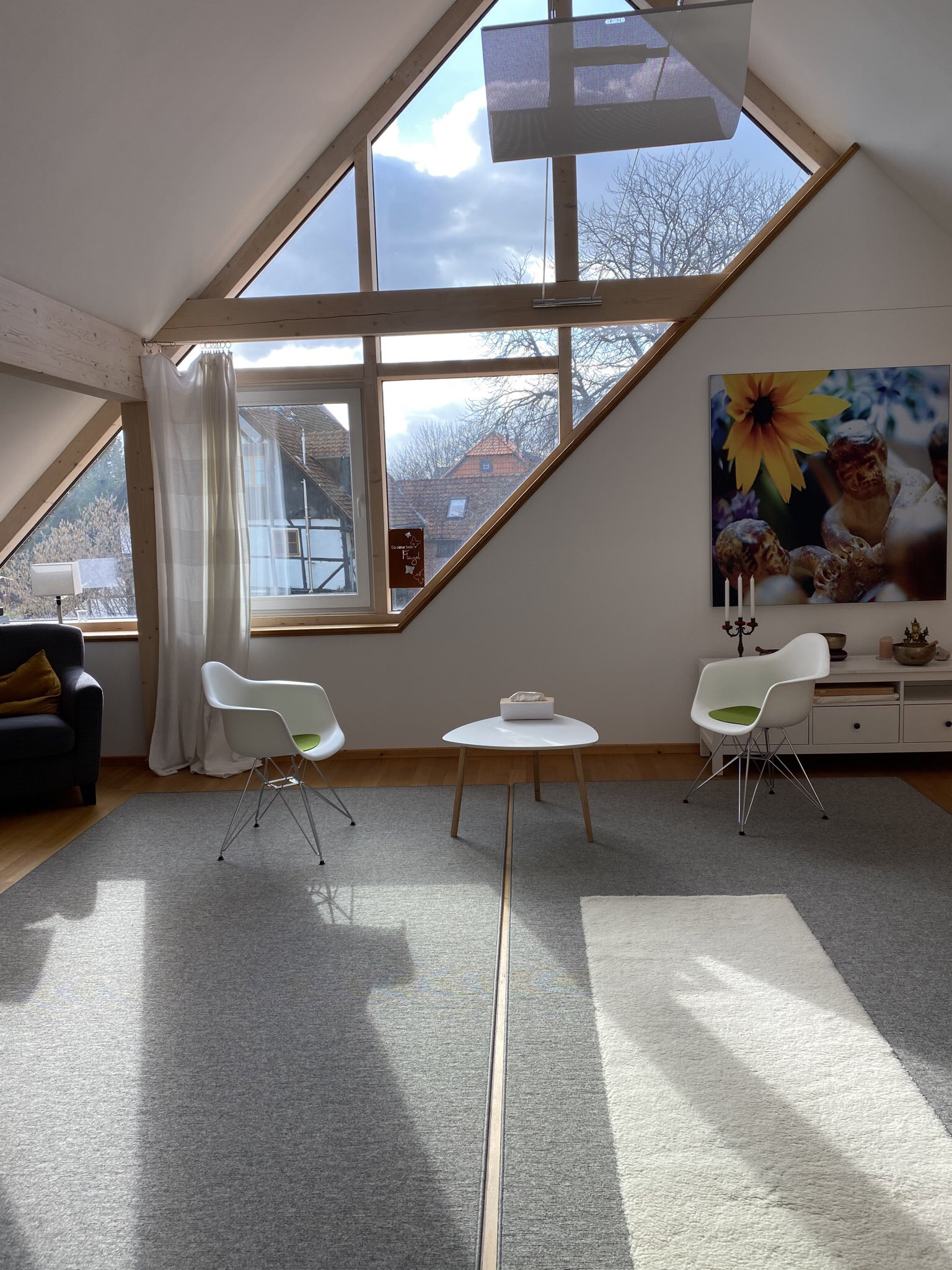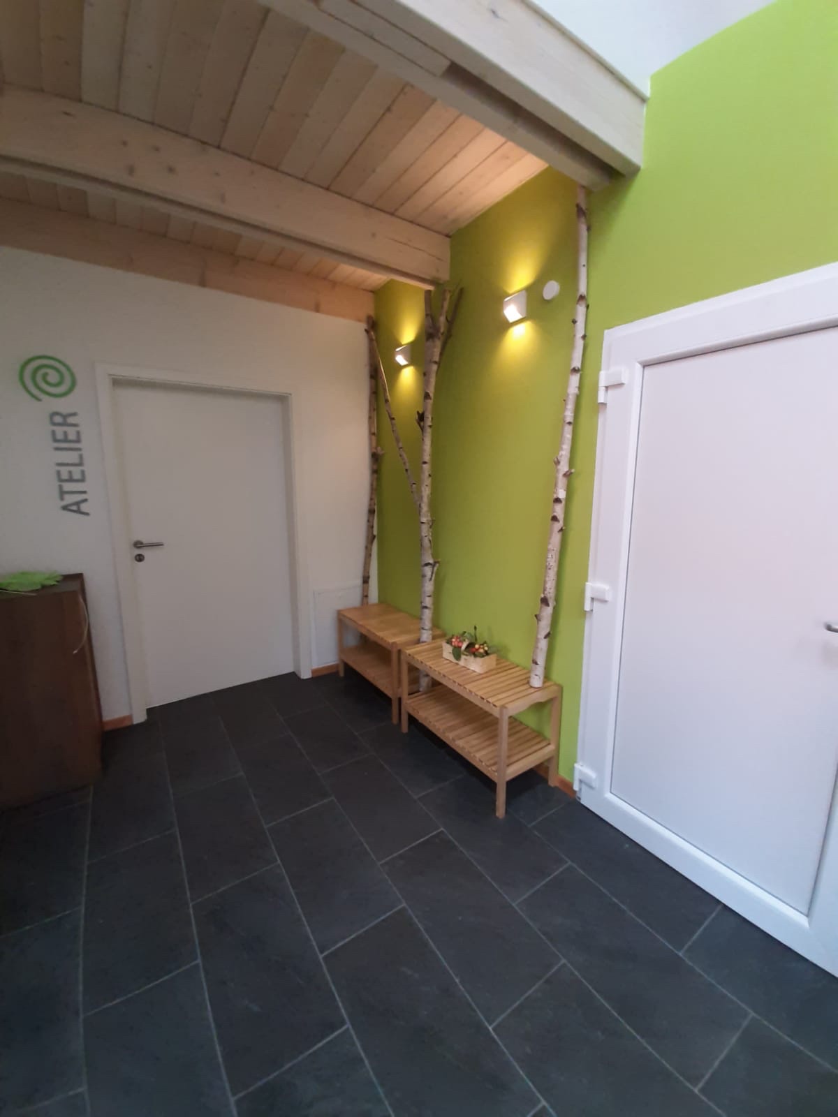 Das Atelier ist mega vielseitig nutzbar. Im Atelier kann sich kreativ ausgetobt werden (da darf auch schon mal Farbe auf den Boden tropfen, dafür ist extra Bodenfließ vorhanden). Dort können aber auch sehr gut Einzelsitzungen stattfinden. Stühle, Couch, Hänge-Schaukelstuhl, Tische – alles vorhanden. Sogar ein Klavier.