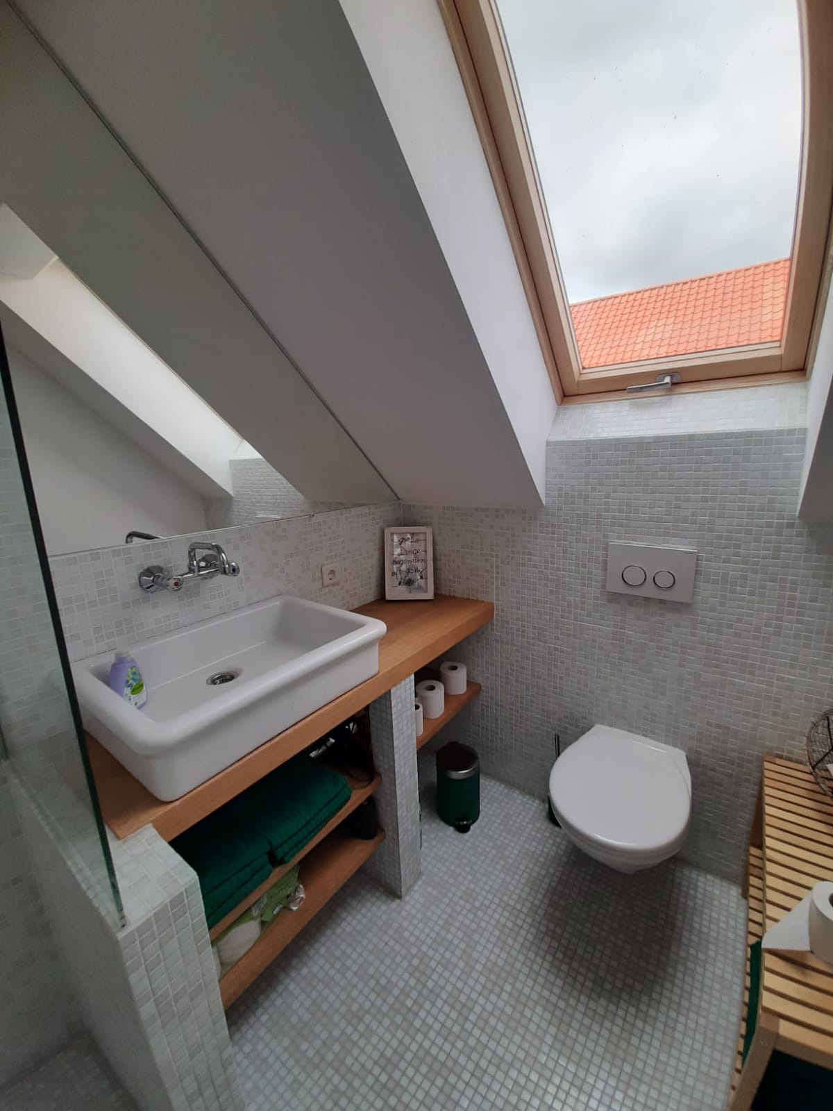 Zum Atelier gehört auch ein eigenes kleines Bad mit Dusche. Vor der Fensterfront des Ateliers steht ein wunderschöner uralter riesiger Baum, von dem eine ganz besondere kraftvolle Ruhe ausgeht.