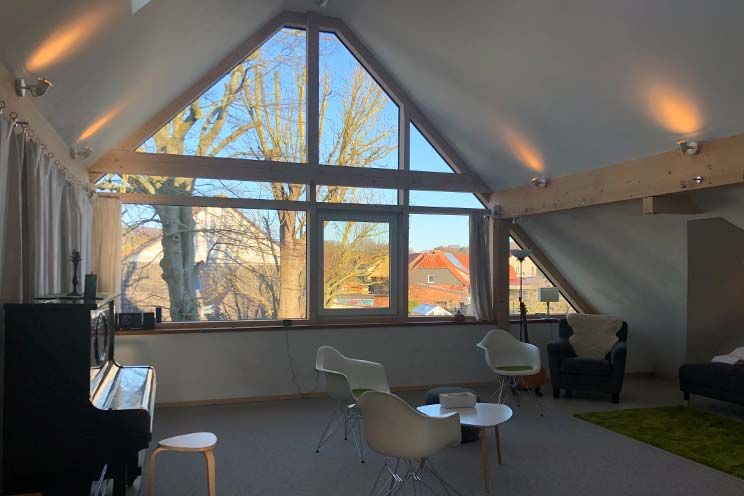 Der freiraum in Evessen ist (räumlich) ein ausgebautes großes Scheunendach mit zwei großen hellen Räumen und offenem Dach. Beide Räume sind durchflutet mit Tageslicht und haben eine komplette Fensterfront. Fotos gibt’s weiter unten zu sehen.